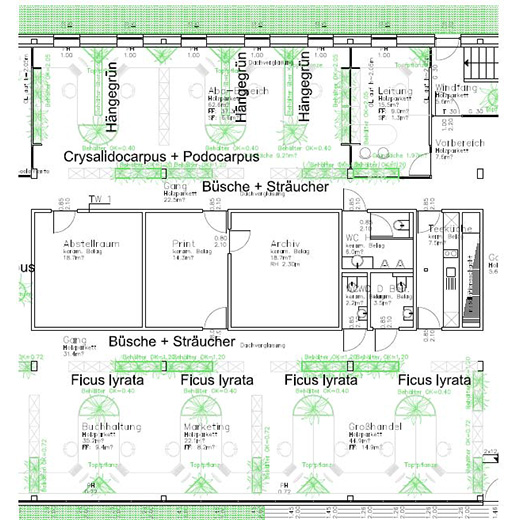 Im Rahmen der Simulation wurde der äußerst dynamische Betrieb des neuen Hauses mit wechselnden Belegungszahlen, Arbeits- und Öffnungszeiten rechnerisch ebenso berücksichtigt wie die Reaktion des Gebäudes und der Pflanzen auf all diese Einflüsse. Mit Hilfe dieser Methode konnte das Büro P. Jung die zukünftigen Innentemperaturen und den Energiebedarf vorab berechnen und in immer neuen Variationsrechnungen schrittweise optimieren.