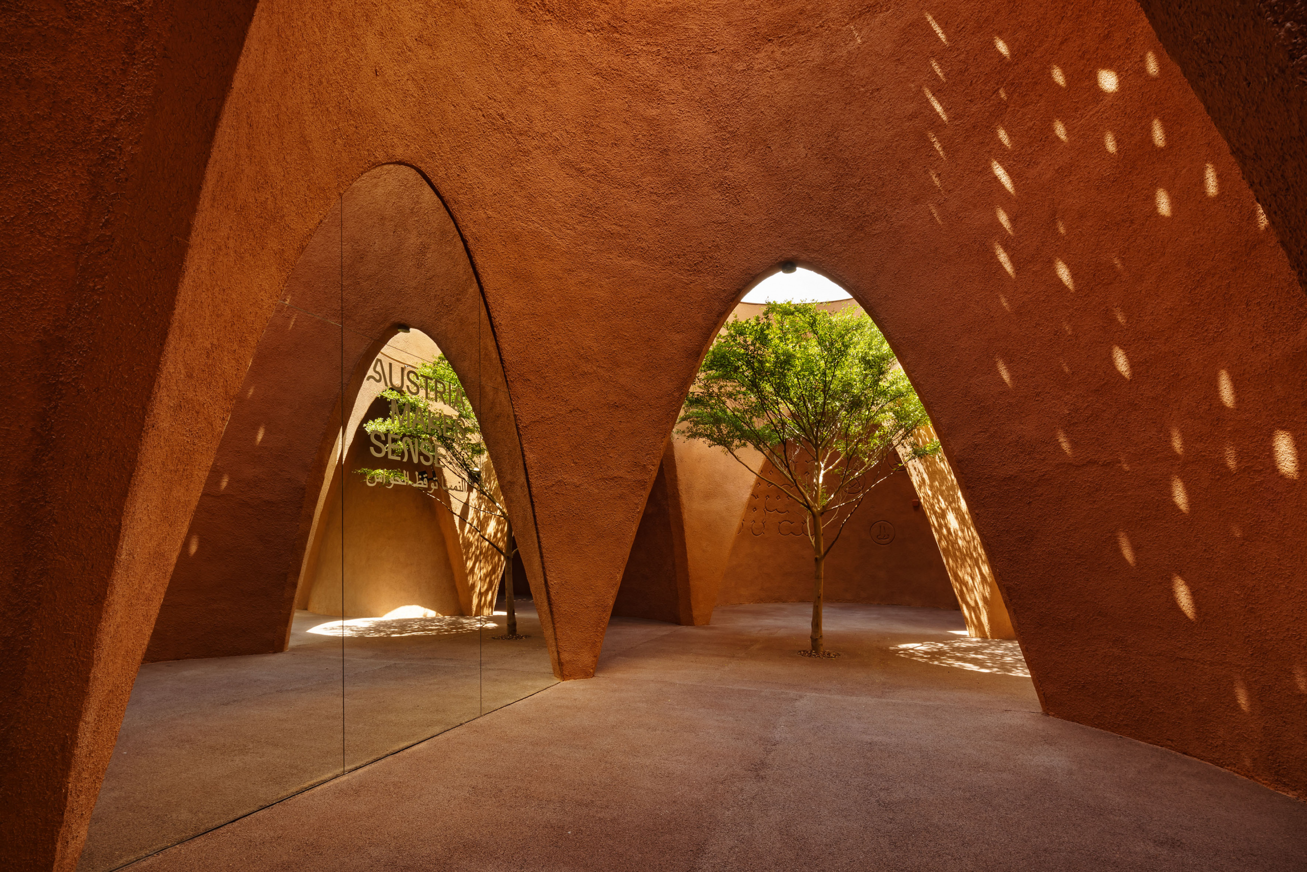Die Ausnutzung des Temperaturunterschieds zwischen Tag und Nacht und die architektonisch prägenden Kegel sind in beiden Bereichen das funktionale Rückgrat des Lowtech-Klimakonzepts nach Vorbild der traditionellen arabischen Elemente des Windturms (Malqaf) und des Windfängers (Bagdir). Die auf den Kegelspitzen des Innenbereiches angeordneten transparenten Abdeckungen sind tagsüber geschlossen, nachts öffnen sie und nutzen den thermischen Auftrieb für eine forcierte Luftströmung zur Kühlung des vier Zentimeter dicken Lehmputzes und der thermisch erdgekoppelten Bodenplatte, die als Speichermassen wirken. Tagsüber nehmen sie die Überschusswärme wieder auf. Frischlufteinbringungen und Deckenventilatoren sind so angeordnet, dass sich eine moderate Luftbewegung in den Räumen einstellt, die das Behaglichkeitsempfinden deutlich steigert. Auch im unkonditionierten Ausstellungsbereich wirken sich Speichermassen und Luftbewegung positiv auf das Temperaturempfinden aus. Eine Hochdruck-Nebelanlage im Eingangsbereich und Ventilatoren in den weiteren begrünten Zonen sorgen für zusätzliche Kühlung. So kann der Energiebedarf verglichen mit konventionell gekühlten Gebäuden gleicher Größe um ca. 70 Prozent reduziert werden.
