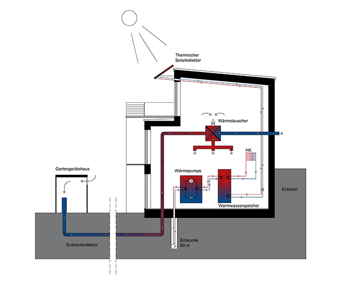 Die Brauchwassererwärmung geschieht zu 70% über Kollektoren, die als sommerlicher Schattenspender in optimierter Position zu den Südfenstern platziert wurden. Die Heizenergie von 14 kWh/ m2a wird durch Erdwärme bereitgestellt. Jede Wohneinheit erhält eine eigene, ca. 60 Meter tiefe Sondenbohrung, kombiniert mit einer Sole-Wasser- Wärmepumpe und einem 600-Liter-Wärmespeicher. Die gesamte Versorgung mit Frischluft und Wärme wird mit Geräten von Stiebel-Eltron sichergestellt. Die Technik hat sich in der Praxis bewährt, so das Ergebnis der Messungen der BUGH Wuppertal. Alle Systeme werden über eine einzelne optimierte Regel- und Steuereinheit kontrolliert, was für die hohe Effizienz des Gesamtsystems entscheidend ist.