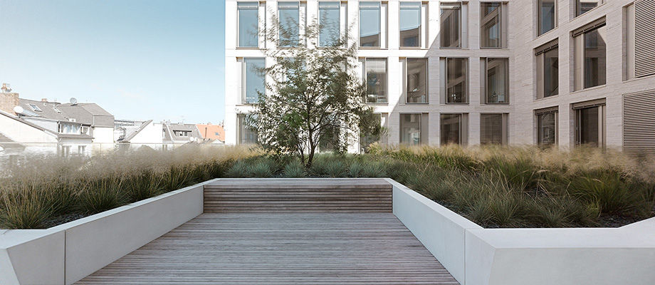 Natursteinfassaden und Betondecken dienen als Speichermasse. Alle Decken wurden thermisch aktiviert. Abgependelte Akustikpaneele reduzieren effektiv die Nachhallzeiten. Dezentrale Lüftungsgeräte versorgen genau nach Bedarf jeden einzelnen Raum mit Luft und Wärme. Der Sonnenschutz reflektiert das Tageslicht in die Raumtiefe und schützt gleichzeitig vor Überwärmung.